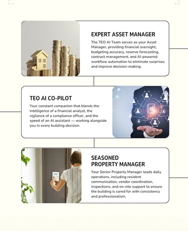 A complete building management service that blends the strengths of a traditional property manager, an asset manager, and the TEO AI Co-pilot — all under one integrated team. This approach is transparent, efficient, and owner-focused — addressing operational challenges quickly, protecting your investment, and improving long-term property performance.