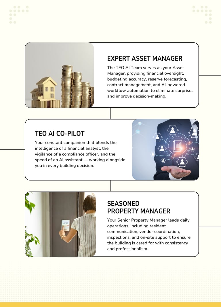 Property Management handles operations; TEO AI oversees finances. No overlap. No confusion. No missed responsibilities.